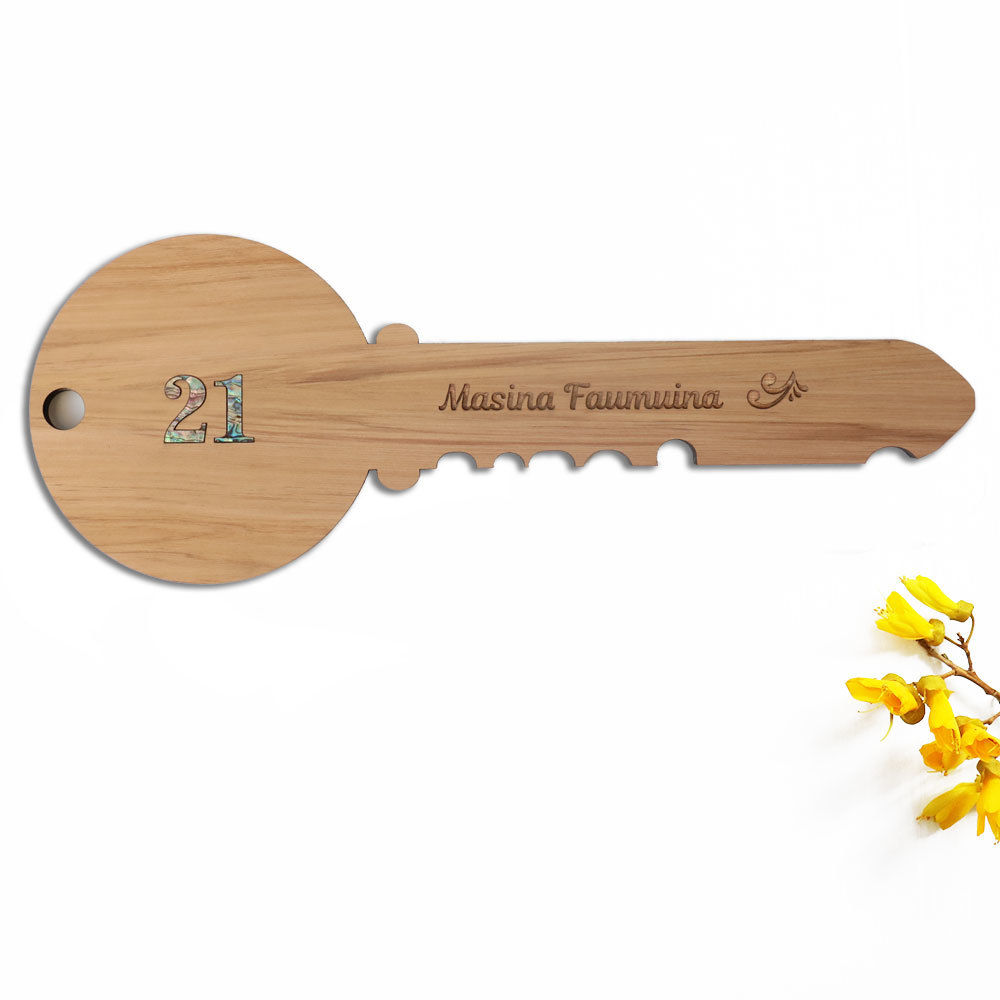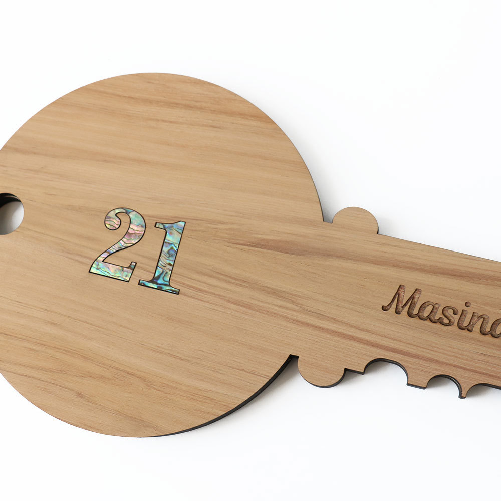 Our everyday style 21st Key is your simple option for that all important 21st Birthday celebration. The keys are made from a native Rimu veneer on a natural plywood base. The key is easy to write on using a ballpoint pen and the numbers "21" are a Paua shell inlay. Personalise the keys with a person's name and small message if you wish. The keys can be used for any special occasion, from birthdays to anniversaries.
