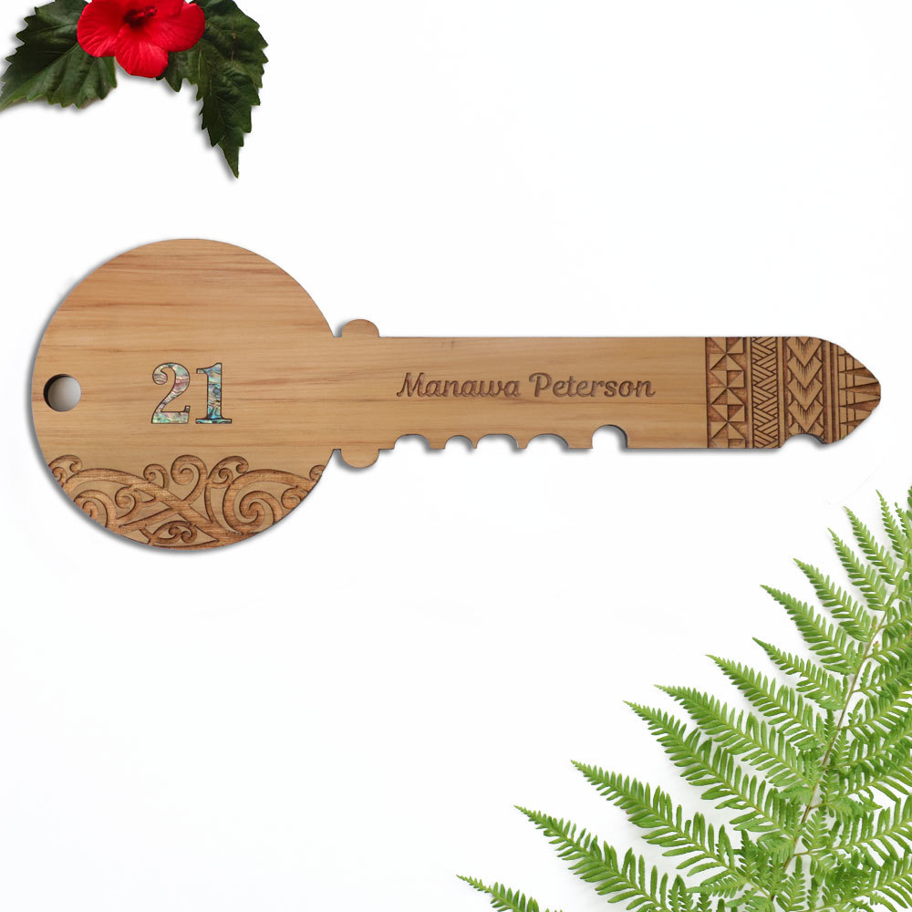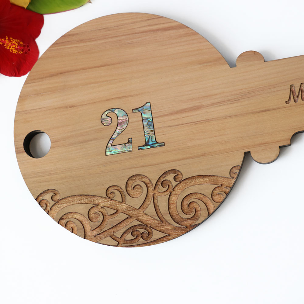 21st Keys that stand out, engraved with both Maori and Pasifika inspired designs. The keys are made from a native Rimu veneer on a natural plywood base. The key is easy to write on using a ballpoint pen and the numbers "21" are a Paua shell inlay. Personalise the keys with a person's name and small message if you wish. The keys can be used for any special occasion, from birthdays to anniversaries.