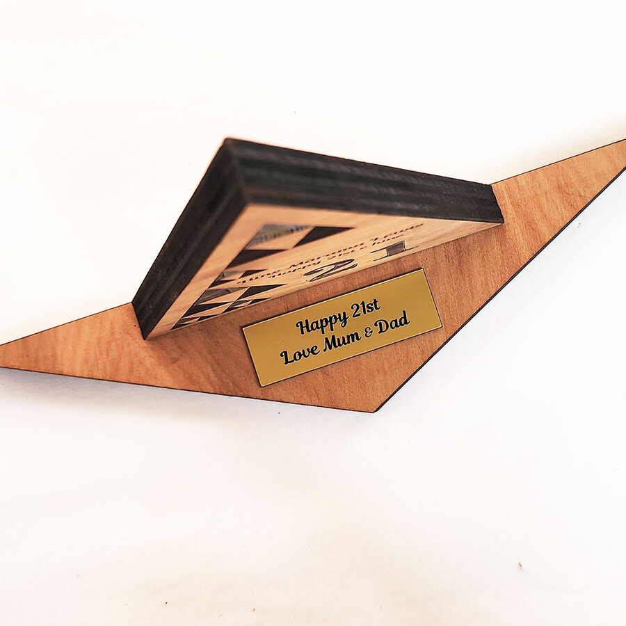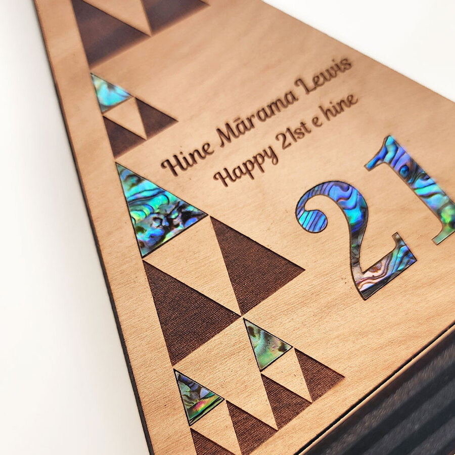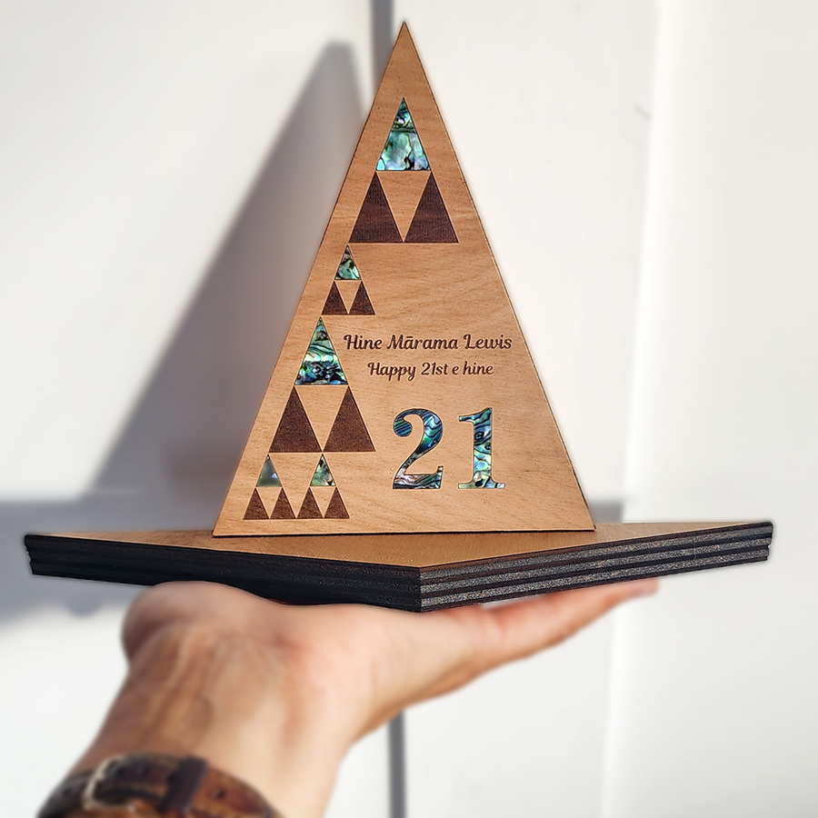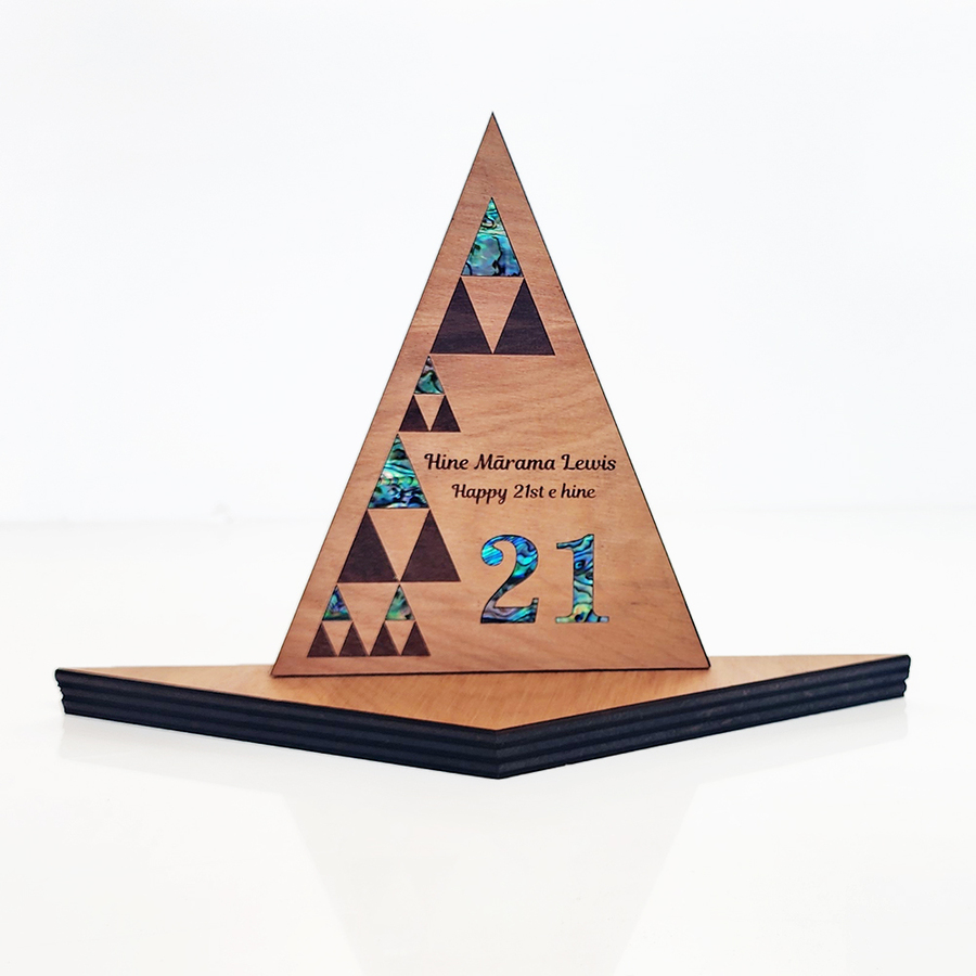 Engraved and inlaid with beautiful Paua shell, these Triangle Tapatoru can be personalised with a name and small message, add an optional Gold badge for a Psalm or From message. The badges can placed on the base or the back of the Triangle. Prefer to have these framed? Yes, the Triangle (not including the base) can be framed in a Black Box Frame.
