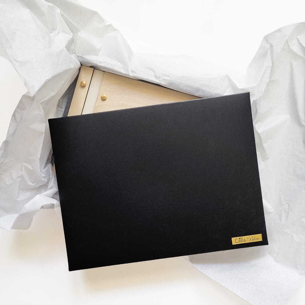 Matt Black Gift Boxes in an A4 size, ideal for our Guestbooks and Portfolios but also a great option for our journals with added spaced for you to add an extra few things. Made from matt black card, adorned with a gold branded badge and lined with white tissue paper.