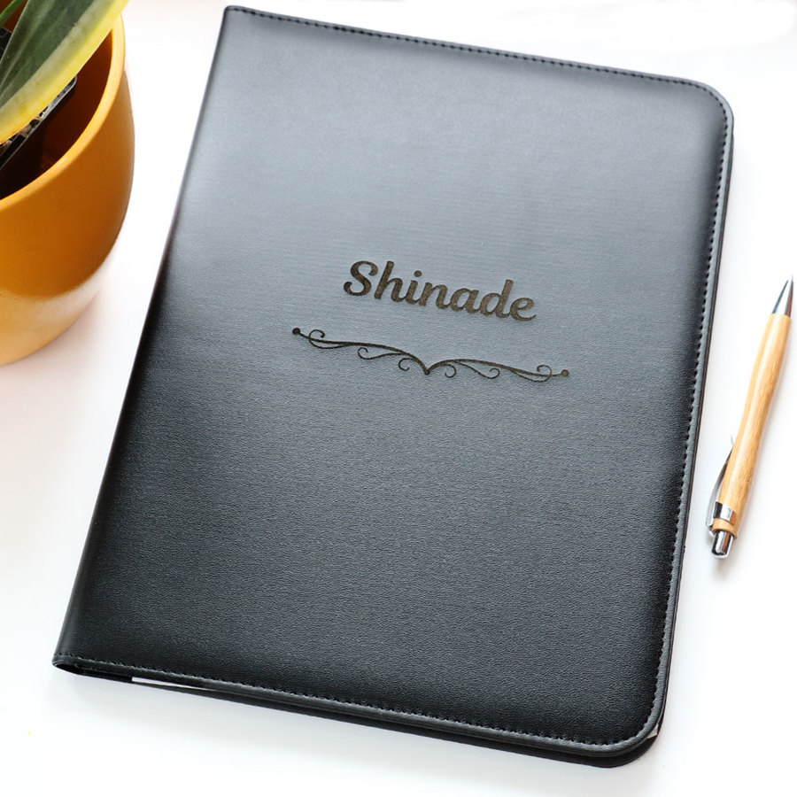 Our Black faux leather Portfolios are a wonderful gift for someone special, perhaps a work colleague, someone starting their career or graduating from university. Engraved with your choice of wording with an optional artwork for extra appeal these portfolios will be a very thoughtful and functional gift or why not just get one for yourself.