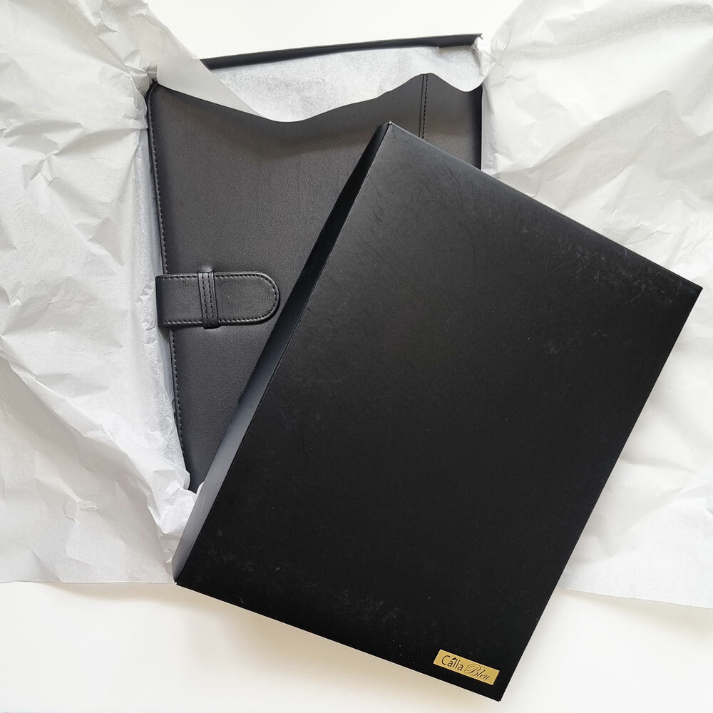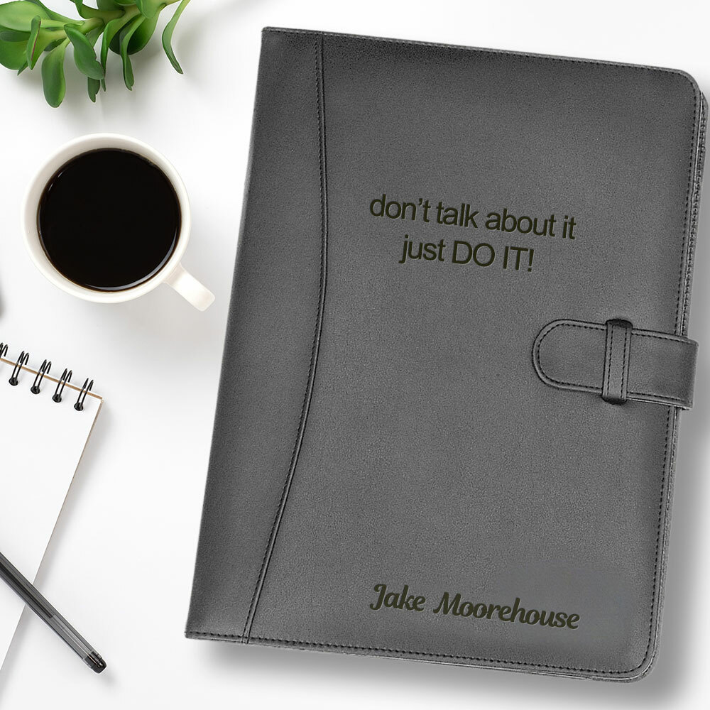 Our Black faux leather Portfolios are a wonderful gift for someone special, perhaps a work colleague, someone starting their career or graduating from university. This Portfolio has a secure closure strap, writing pad, interior pockets and calculator as well as a pen holder (pen not included). Engraved with your choice of wording with an optional artwork for extra appeal these portfolios will be a very thoughtful and functional gift or why not just get one for yourself?