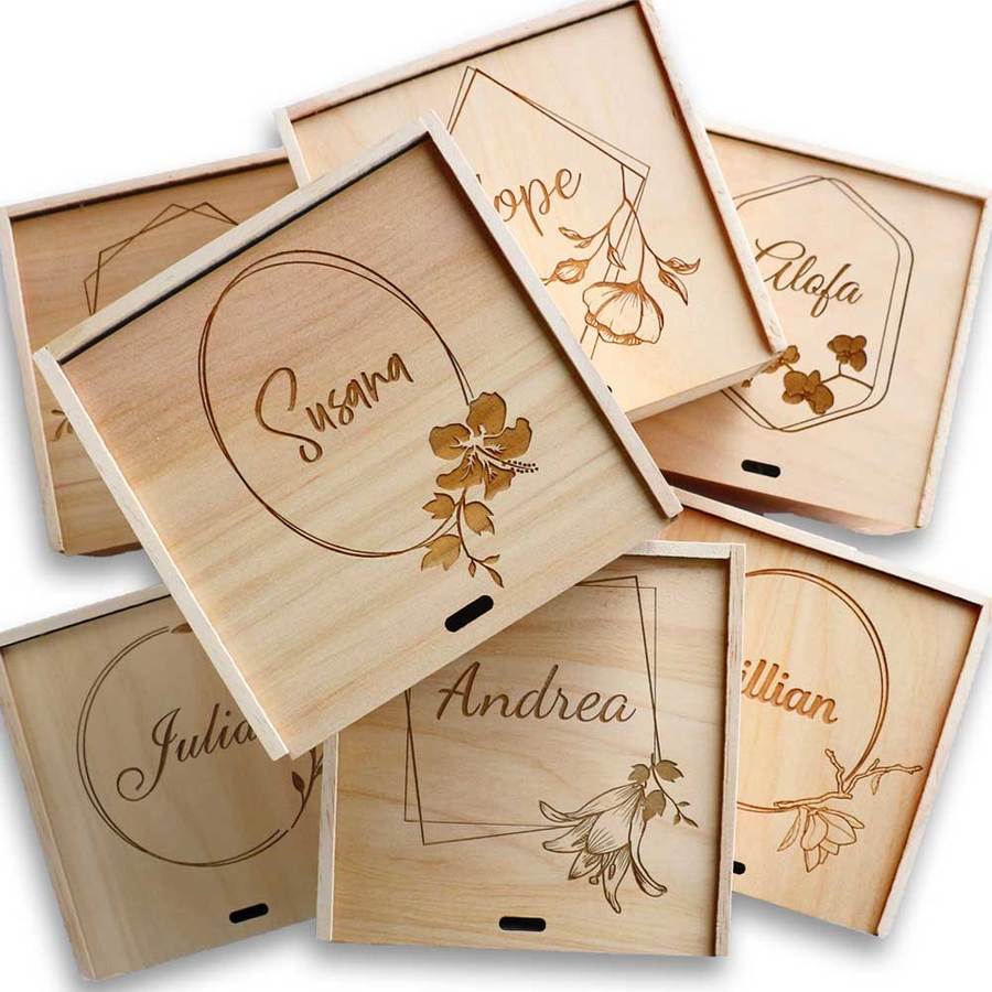 These elegant Bridesmaid Boxes with an engraved sliding lid are a wonderful option to fill with all those special things fit for anyone in the bridal party. These engraved boxes will become a treasured keepsake of a special day and they can be used to store so many things. There are several artwork options of shapes and floral features and you can choose from a selection of different fonts. Why not get a different design for each box, they are all stunning!