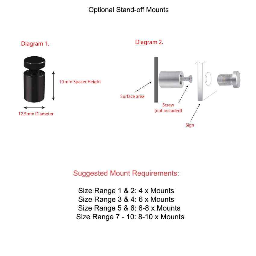 - If purchasing Standoff Wall Mounts, we suggest ordering for placement at spacings of 400-500mm (see images for more info).