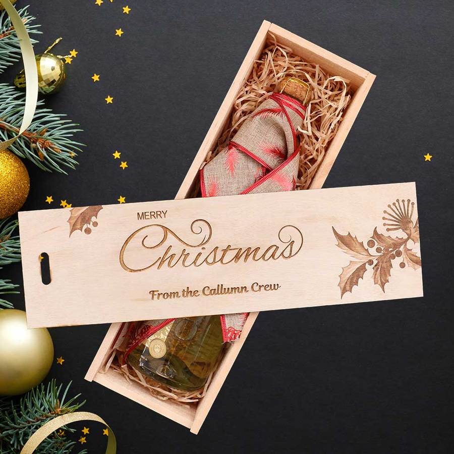 These Christmas Bottle Boxes come engraved with a gorgeous festive design and can be personalised with your choice of wording. Fill them with a bottle of bubbles and gift to someone special this Christmas.