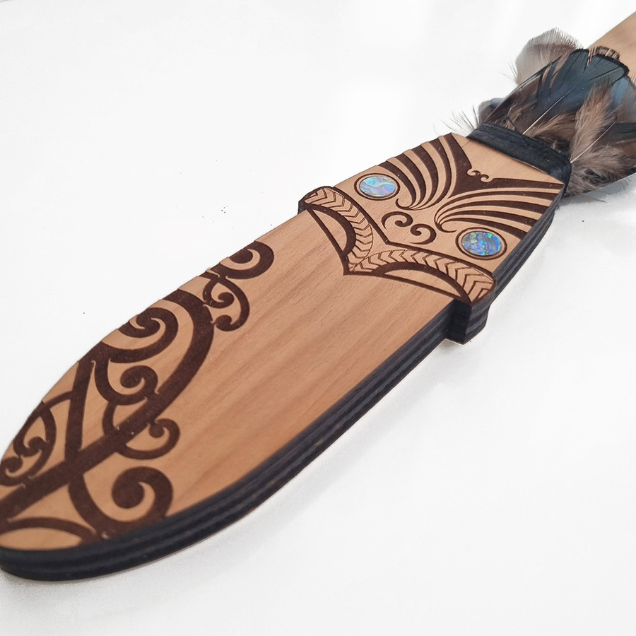 Celebrate life’s milestones with this framed Māori Taiaha, a powerful and culturally respectful alternative to the traditional 21st key. Beautifully designed to reflect the look of a traditional taiaha, it features a laser-engraved surface, adorned with feathers around the neck and Paua shell inlaid eyes—symbolising strength, leadership, and heritage.
