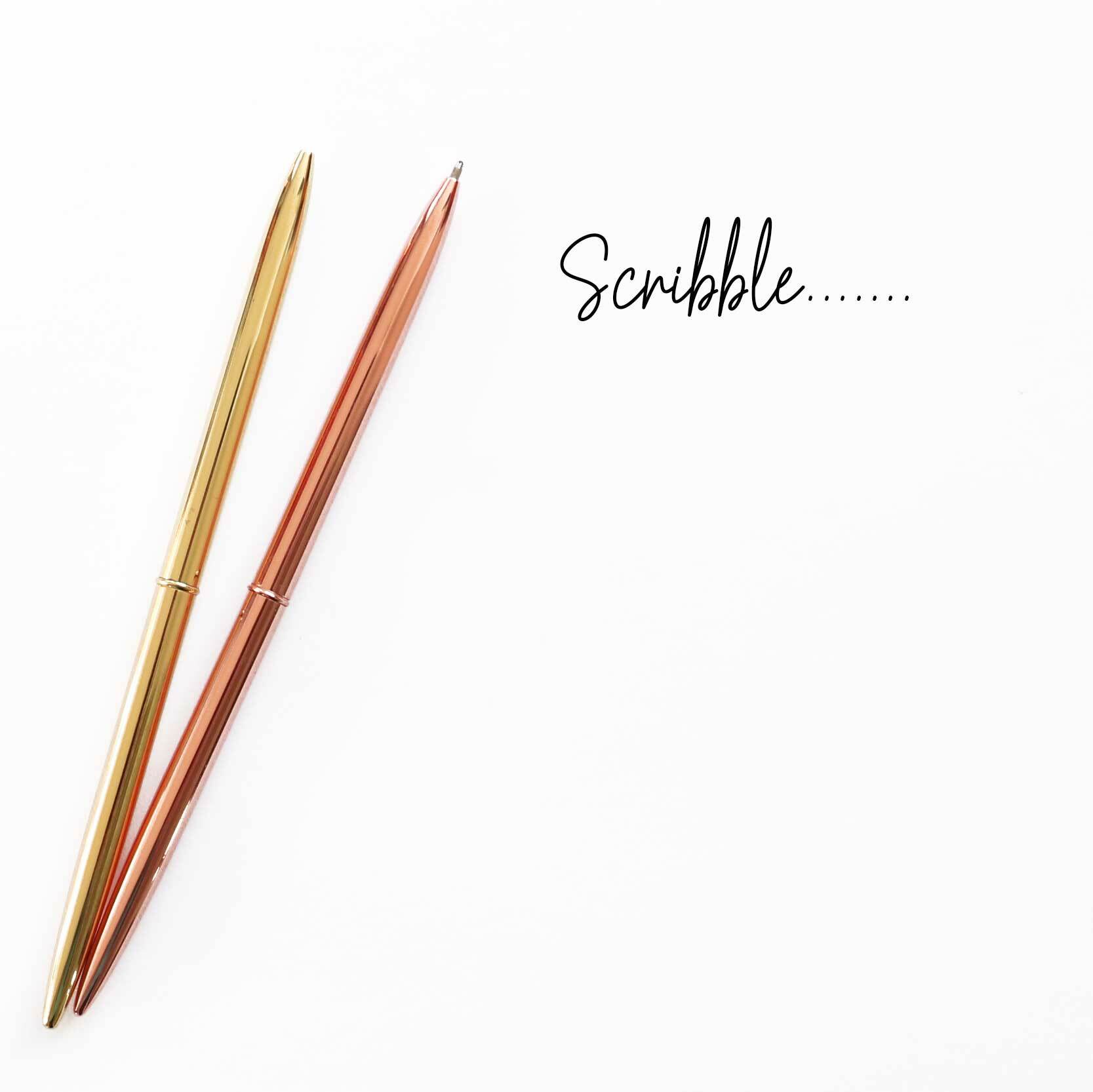 These metal slimline pens in gold, twist in the middle to reveal a ballpoint pen tip. Get one for your guestbook or add it to a gift!