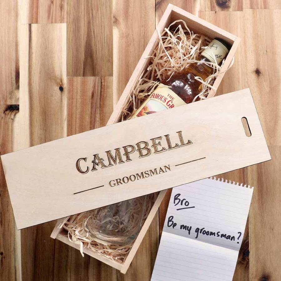 Our groomsmen gift boxes are a great way to pop the "Bro" question. Our personalised wine/bottle boxes will definitely go down well with the boys, fill them with your favourite brew and bend the knee...or just shake hands..Our boxes are made from sturdy New Zealand pine with optional wood-wool filler.