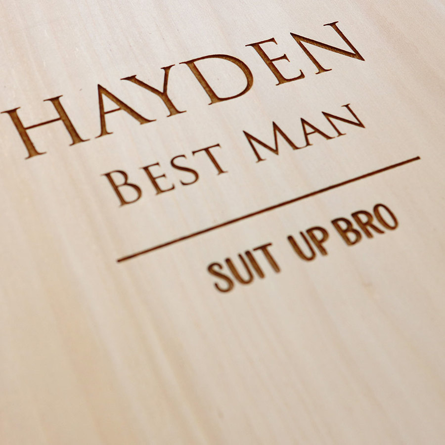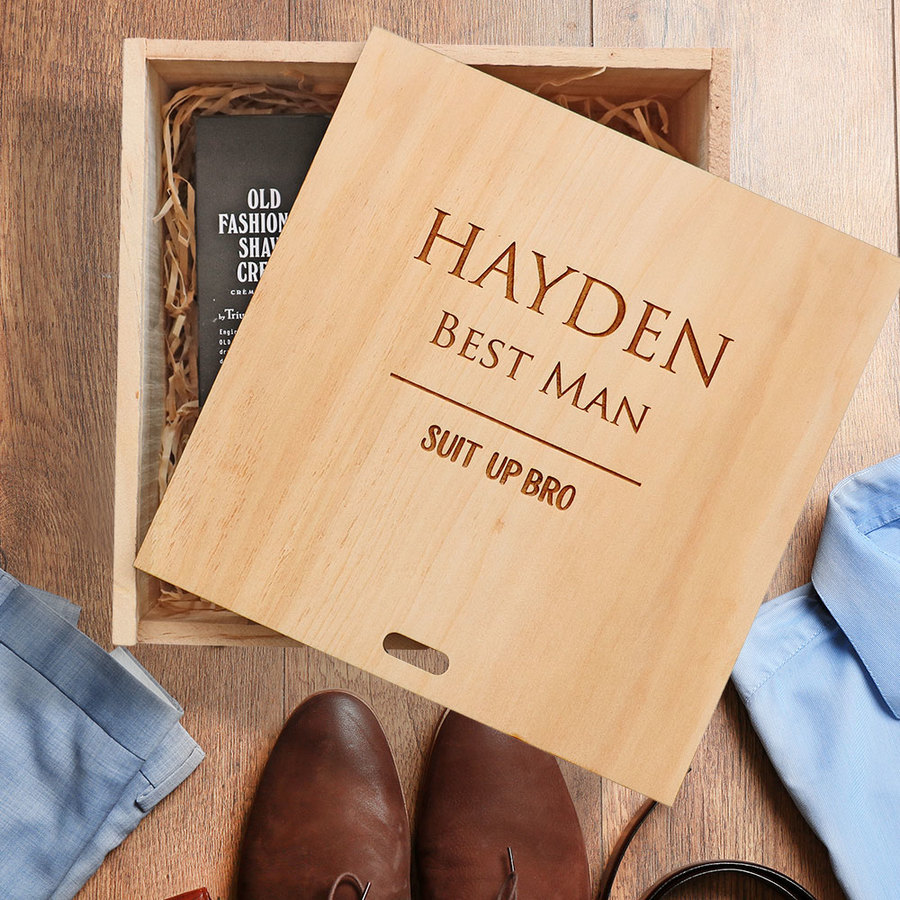 These manly wooden gift boxes with an engraved sliding lid are a top option to kit out and give to mates that make the cut for your Wedding day or any special occasion. These boxes are a decent size and will fit your standard hip flask or golf ball set!