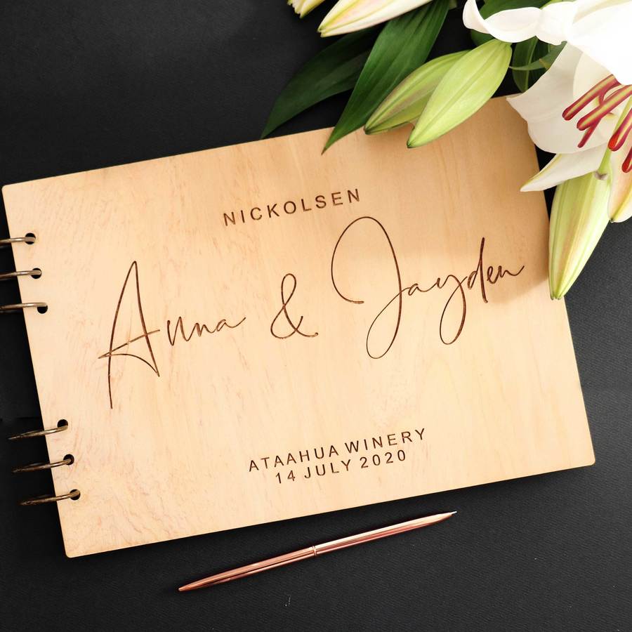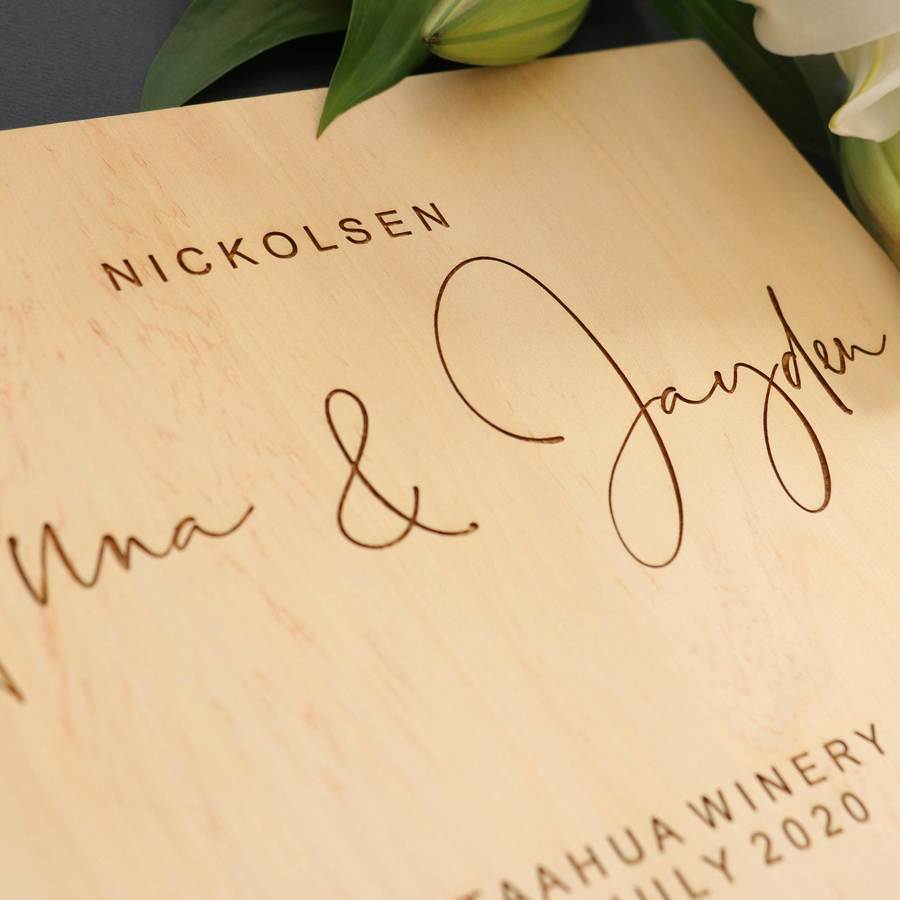 A stunning autograph style font adorns this lovely wooden cover guest book or album. This modern font really makes names stand-out, it will certainly attract the messages and signatures of friends and family. Personalise this book with your details or the details of a loved one for any occasion from Engagements to Weddings, Anniversaries and Memorials.