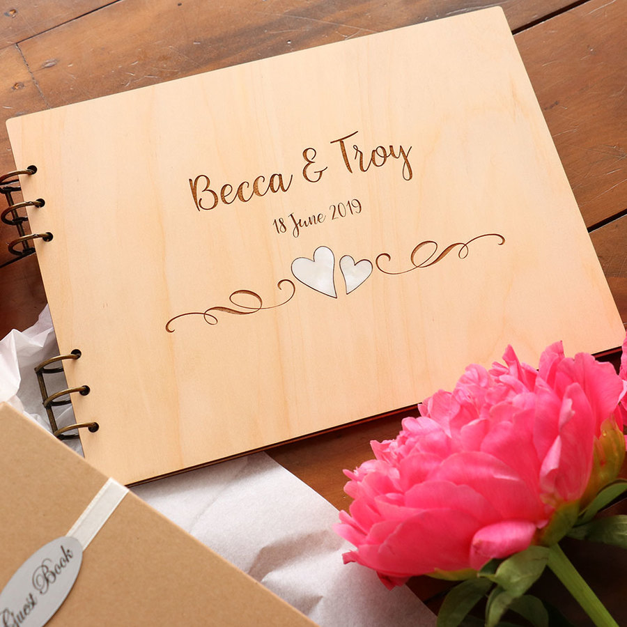 Engraved Guest Book - Hearts with Pearl Shell Inlay