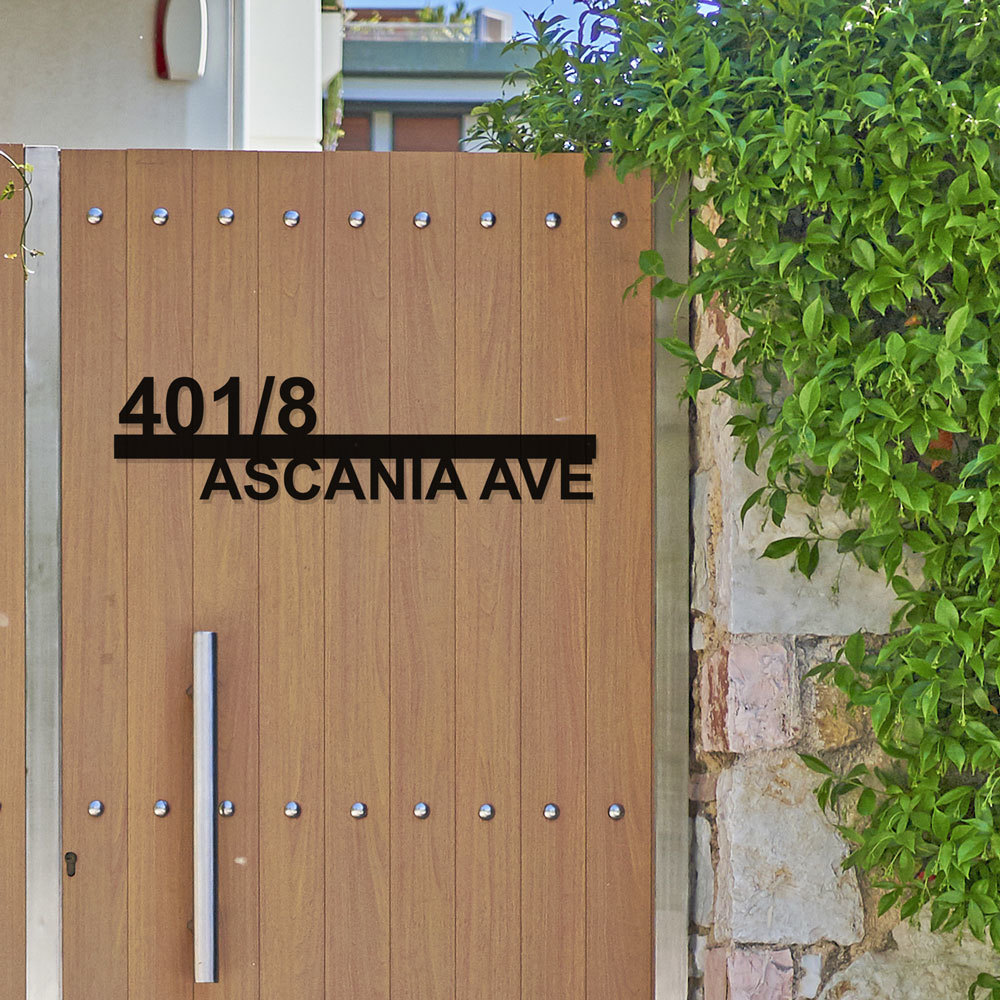 Modern House Number & Street Name signs made from durable Acrylic Perspex are the perfect option for addressing your home or office. A series of screw holes are placed in the central bar, making it easy for you to put or opt for no screw holes and attach as you see fit. Personalise with a street number and name or other wording if preferred. (Pictured: Size 2 - 580mm L)
