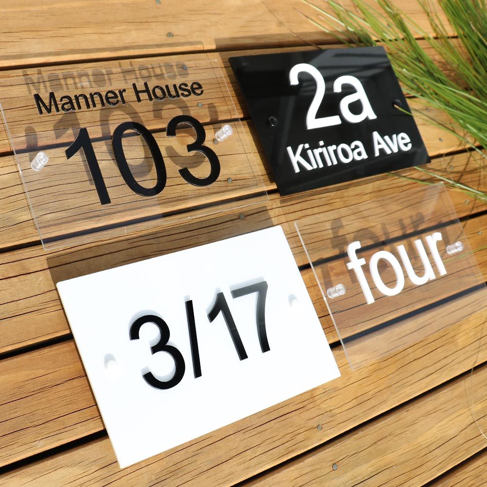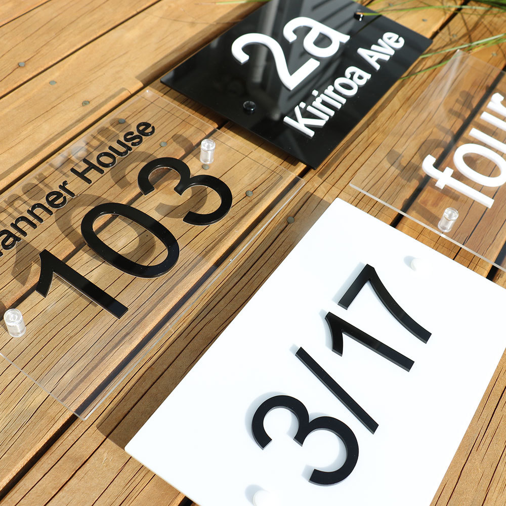House Number Plaques that are not only stylish but highly durable. Made from commercial grade Acrylic Perspex, they will stand the test of time in all weather conditions. Personalise with a street number and name or other wording if preferred. The signs look superb on the exterior of your home or office.