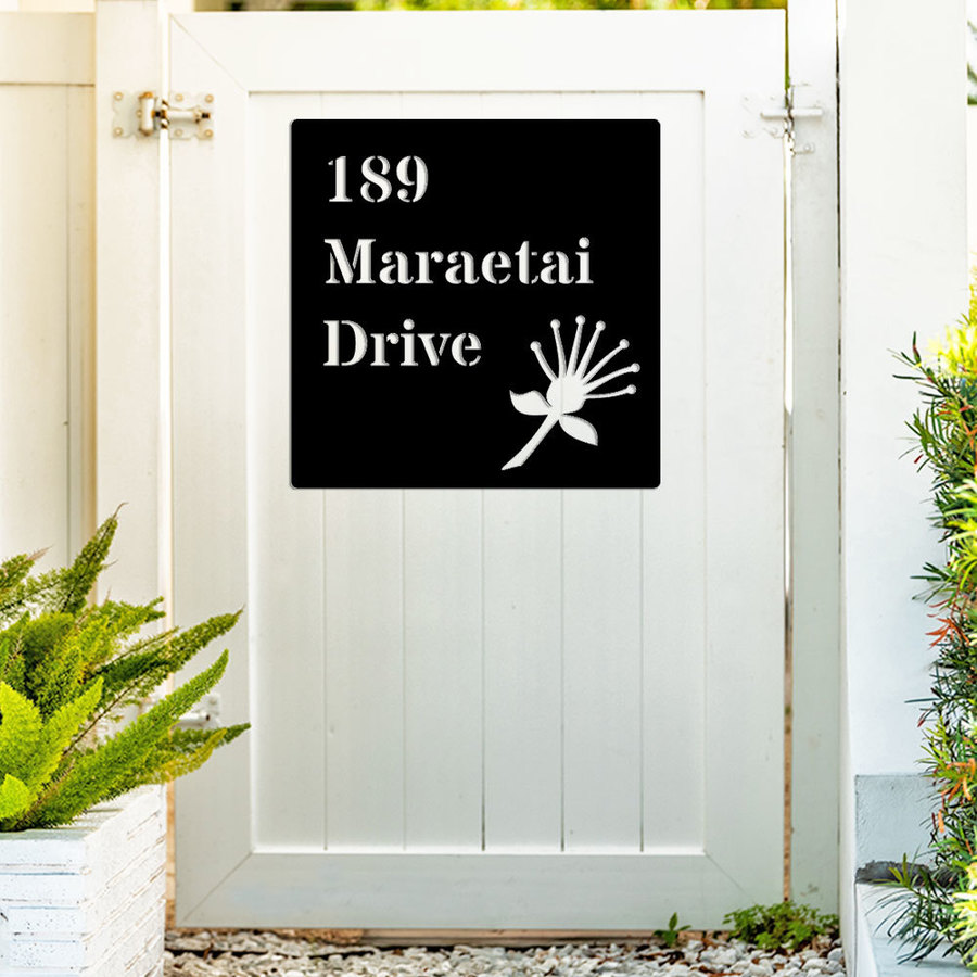 A House Number Sign with a Kiwiana flavour! Decorate your home, bach, beach house, lake house or hidden getaway with one of our stand-out house number signs with a stencil cut Pohutukawa flower. Available in black or white. (Main Picture: Size 400mm, Black)
