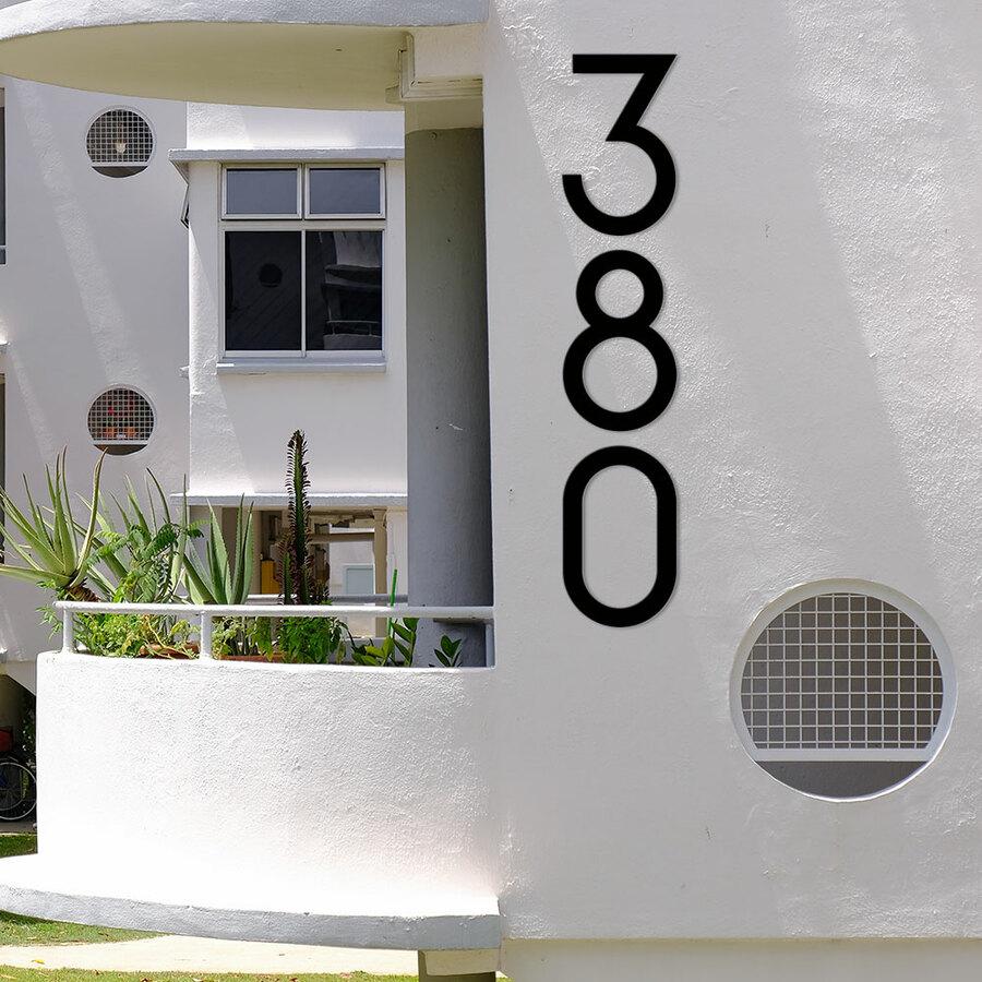 Large house numbers in a retro style available in multiple sizes and in black or white. These numbers and letters are made from durable, weather-resistant commercial-grade Acrylic or Aluminium Composite (ACM). Why not add your street or business name for extra effect? (Pictured: White, 300mm High Numbers)