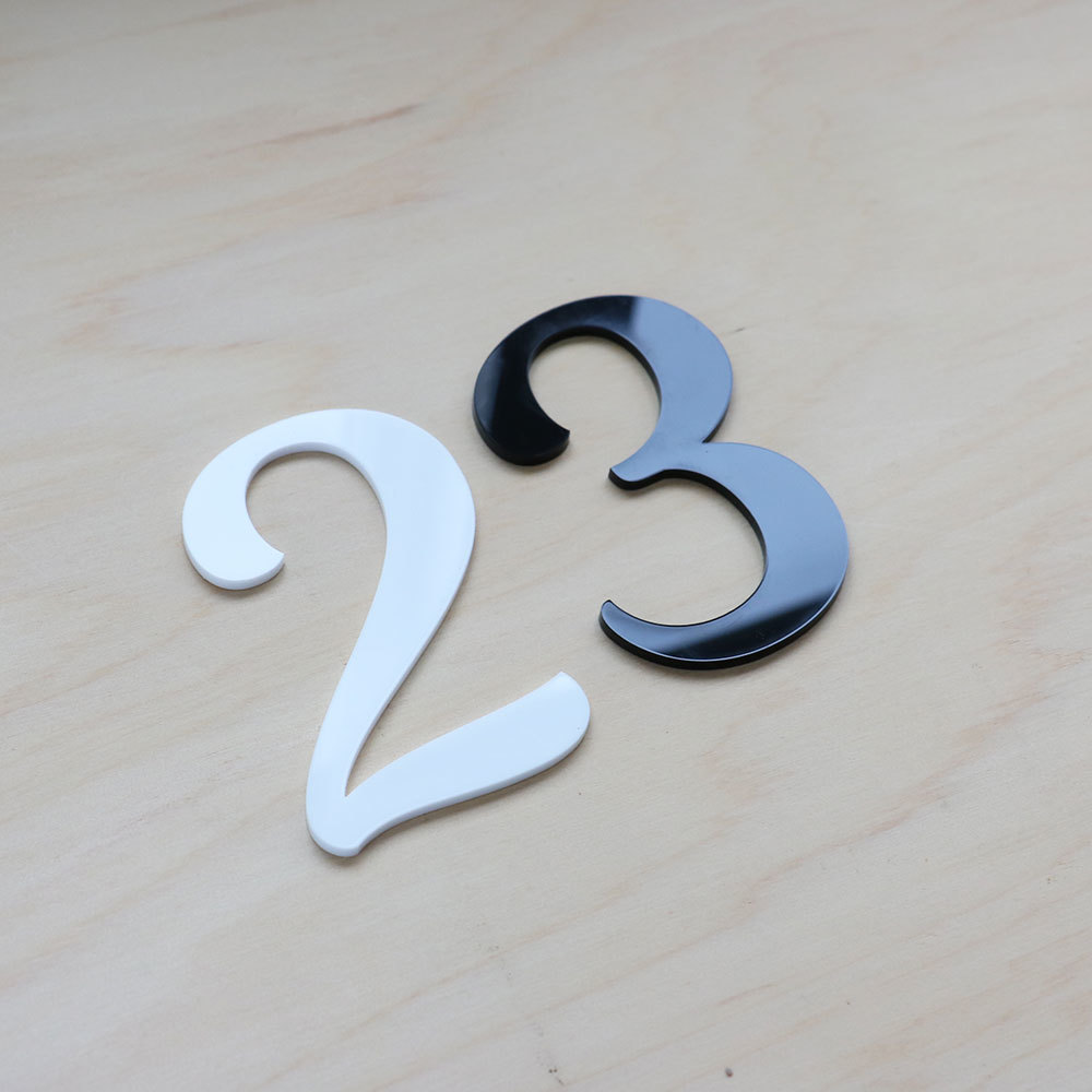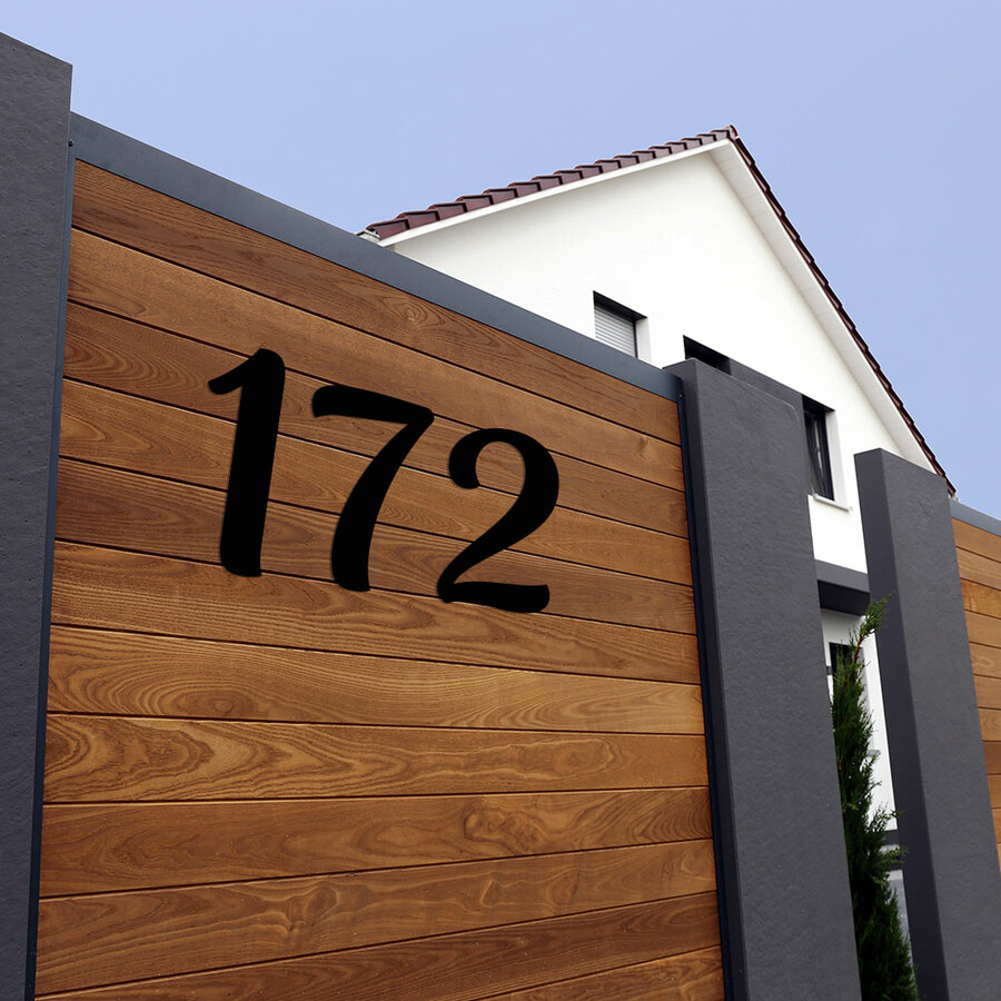 Large House Numbers and Letters in a Tilted style font. Made from durable, weather-resistant commercial-grade Acrylic or Aluminium Composite (ACM). Why not add your street or business name for extra effect? (Pictured: Black, 400mm High Numbers)