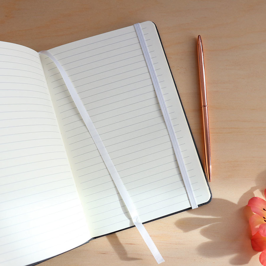 This is a lovely hard cover, textured black faux leather journal with lined pages and an elastic book closure.