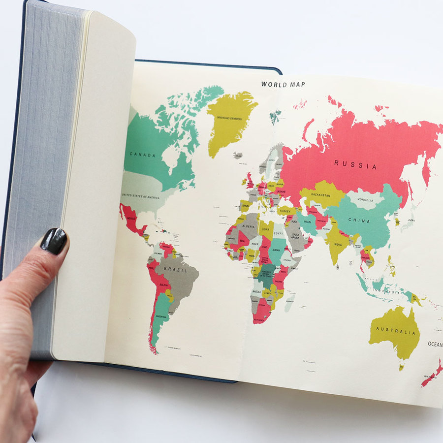 ★★★★Lovely but pen needs to be changedReally lovely book, leather has a great feel. Colour is gorgeous and true to pictures. The world map doesn't fold out as shown in pic. It was pasted in the rear of the book and overlapped the back page. The pen was way too small for the pen holder section so something needs to be changed there.