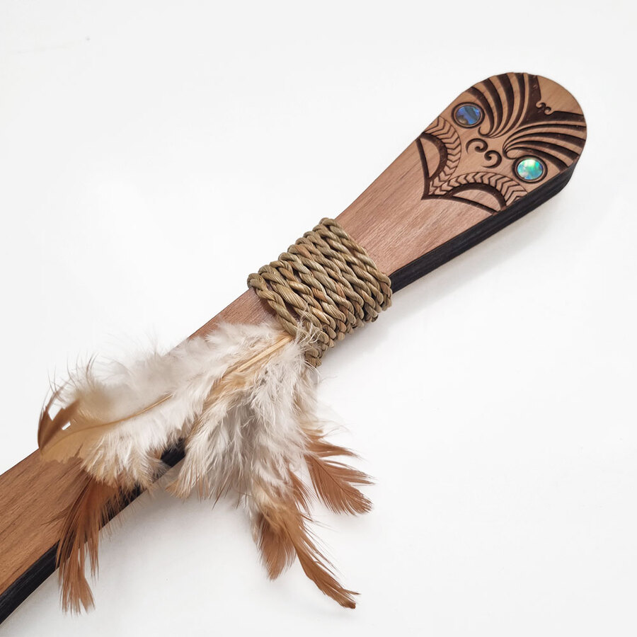 Engraved with our signature Maori designs including a Maori Warrior face at the handle end has the eyes inlaid with Paua shell, this Paddle also features Flax twine and feathers at the handle. These stunning Hoe (Paddles) are made from Heart Rimu veneer and a natural plywood timber base. Personalise the Paddle with a person's name and small message if you wish.