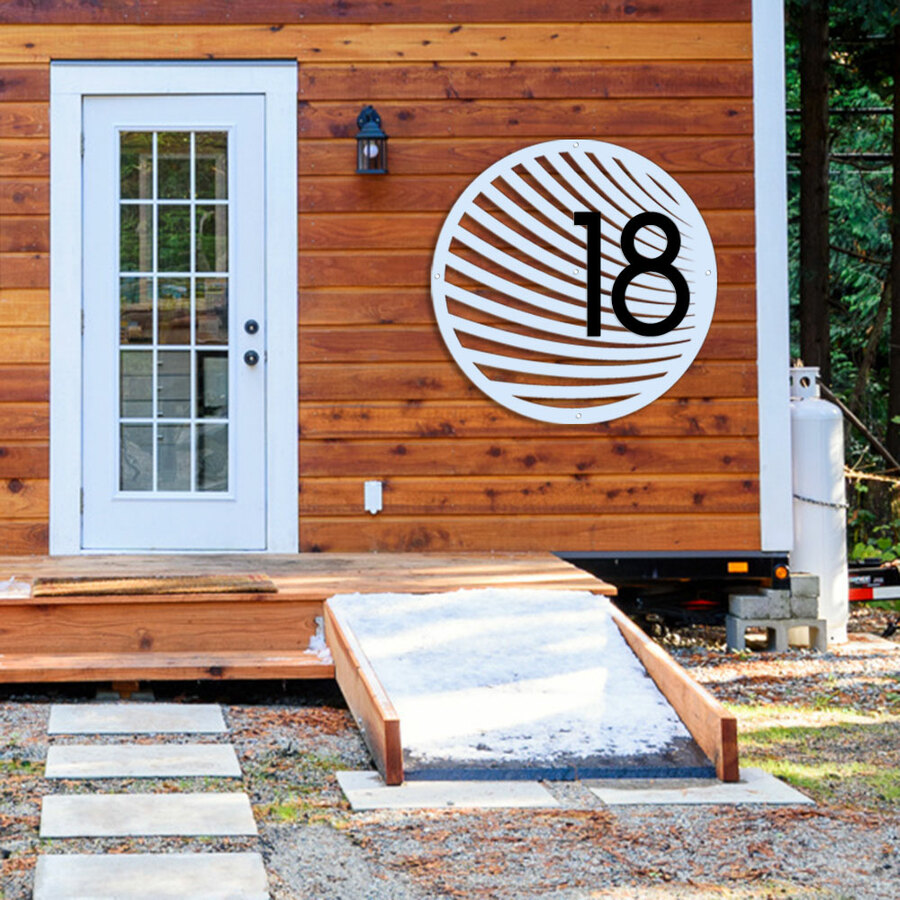 Large Designer Circular House Sign with a Stencil cut pattern backing overlaid with a large house number. This functional piece of art will add street cred to your home or business. Made from durable, high-quality material, this sign is designed not only to look great but stand the test of time in all weather conditions. Available in black on white or white on black and in 3 standard sizes or enquire for a custom size. (Main Picture: Size 3: 1000mm, Black on White)