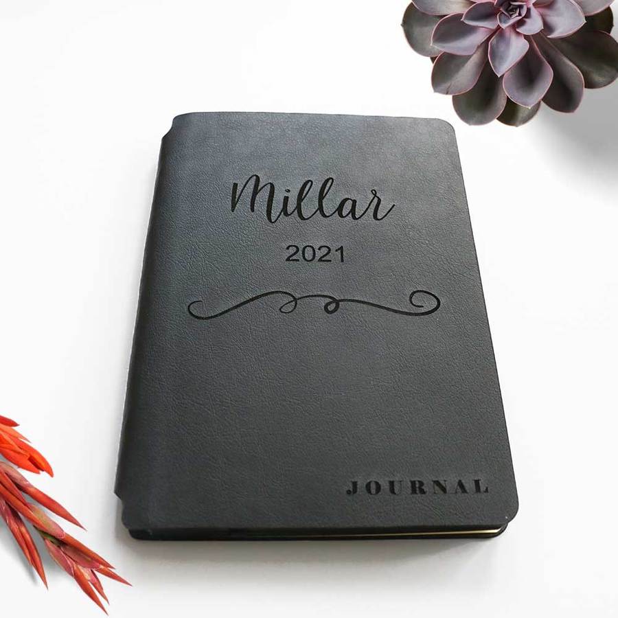 These lovely black soft cover journals make wonderful gifts. Engrave the journals with your choice of wording and gift to someone special or keep for yourself. Choose from 5 artworks and 6 fonts. There are so many uses for these journals from planning your day or recording your life adventures.