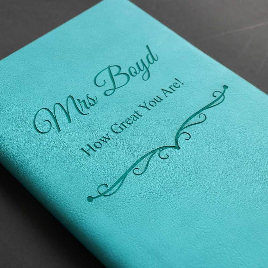 Personalised Journals make wonderful Teacher's Gifts. Engrave with a Teacher's name and a special message of appreciation. The covers are made from soft imitation leather and can be engraved with up to 50 characters. Choose from 5 artworks and 6 fonts.