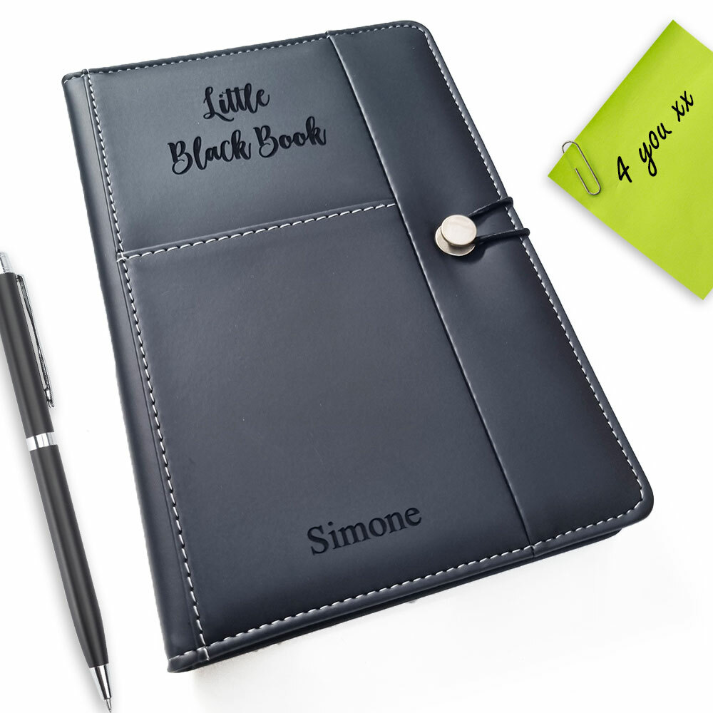 A stunning personalised leather hard-cover journal in black features lovely stitching and a pocket to securely hold your phone or the all important boarding pass! The book comes with a massive 160 pages of high quality lined cream paper, a book mark ribbon and a handy elastic closure to keep those little documents securely within its pages. There are so many uses for these journals from planning your day or recording your life adventures.