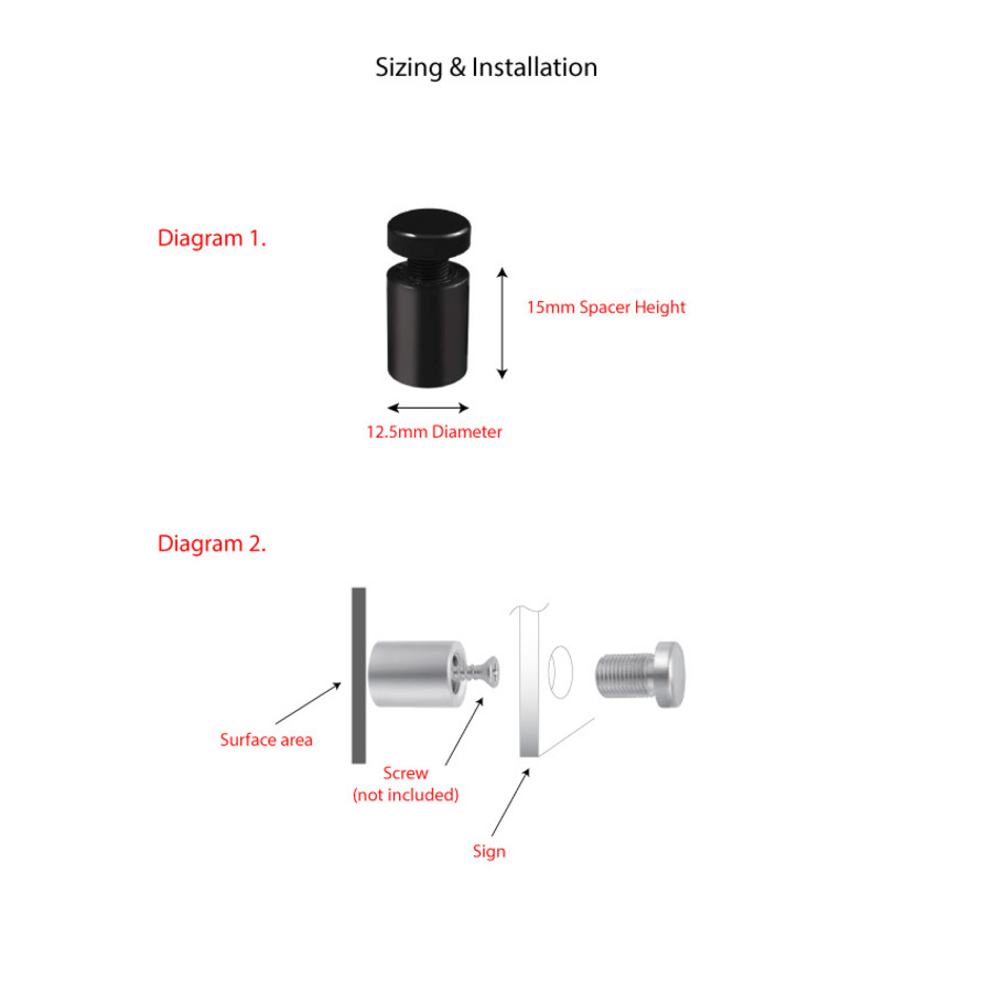 Give your signs status with our Standoff Wall Mounts. The mounts act as a spacer between the sign and the surface area. By selecting this display option for your sign, we will automatically add the holes to your sign for the mounts. Please note, screws are not included as they will be specific to the surface you are screwing to, please enquire at your local hardware store, take with you the mounts and let them know what wall surface type you have.